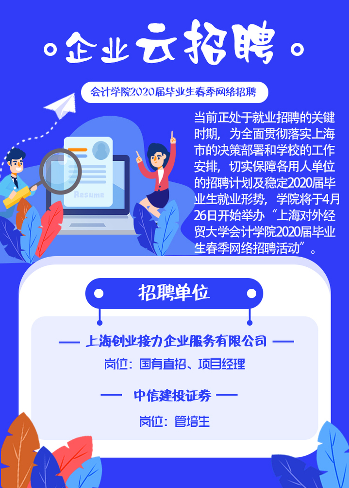 举办会计学院2020届毕业生“云招聘”,广泛发动用人单位和校友、家长、校外导师挖掘更多社会资源,为毕业生提供就业、实习岗位。建立线上O2O体验式招聘,确保疫情期间学生和企业通过视频完成云招聘,目前已有8名学生通过“云招聘”拿到了offer。疫情期间学院主动与多家实习实践基地以及上海新嘉华会计师事务所、复兴财务共享中心、中新建设证券、上海冠生园食品有限公司及上海创业接力企业服务有限公司等20余家用人单位沟通联系,进一步加强实习基地建设、拓展实践基地、洽谈建设专业实习项目等。毕业班辅导员帮助向长三角地区单位投递简历的学生与用人单位电话沟通推荐毕业生。学院进一步筛选“优质用人单位”和长期合作机构,建立了学院、学生和用人单位、校友对人才培养质量和学生适应社会需求等情况的反馈互动联系机制。