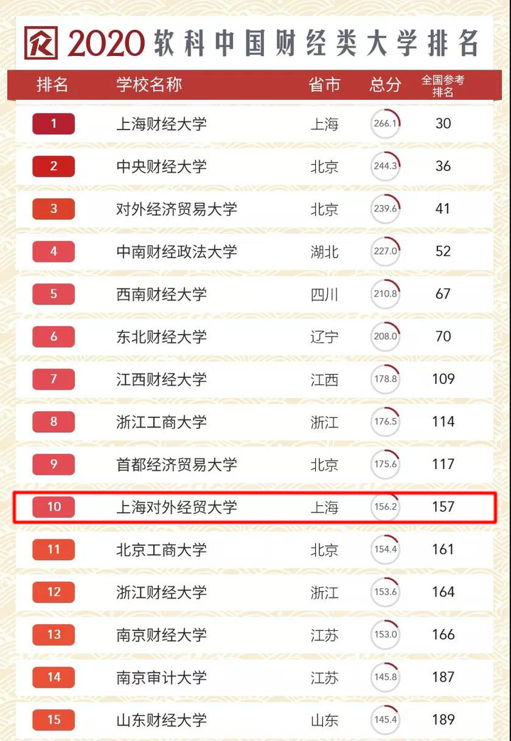 5月15日,全球领先的高等教育评价机构软科正式发布“2020软科中国大学排名”。该排行榜遵循分类排名的原则,对医药类、财经类、语言类、政法类、民族类、体育类等6类单科性大学使用差异化指标体系分别进行排名。在2020软科中国财经类大学排行榜中,上海对外经贸大学位列全国第10名,创造了历史最好成绩。