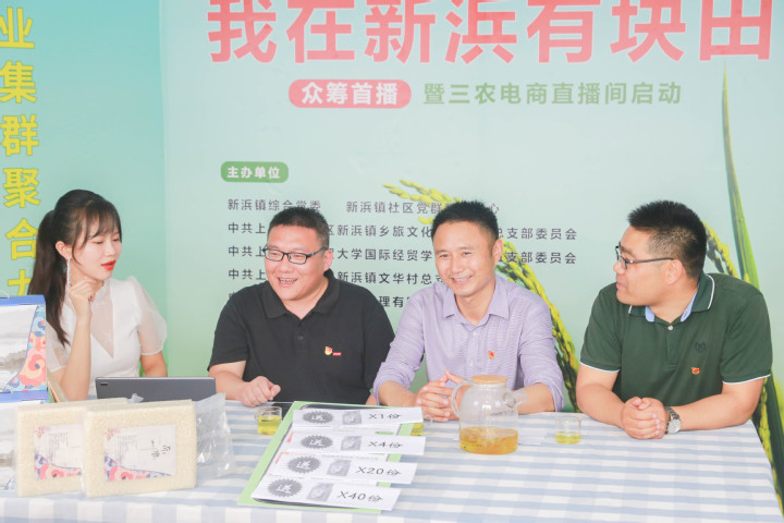 今年是全面建成小康社会的决胜之年,也是决战脱贫攻坚收官之年。打好精准脱贫攻坚战,是党的十九大报告中提出的三大攻坚战之一,对如期全面建成小康社会、实现第一个百年奋斗目标具有十分重要的意义。我校师生也发挥专业优势,参与脱贫攻坚和乡村振兴计划。5月17日上午,由我校国际经贸学院教工第五党支部全程策划和参与实施的校地企党建联动实践基地“三农电商直播间”首播活动在松江区新浜镇文华村党建服务中心举行。本次活动以“党建引领乡村振兴”为主题,依托高校、企业及农村基层党组织党建联动实践基地,发挥高校专业优势,协力打造一个开放共享的“三农电商直播间”,以“抗疫助农和直播带货”的形式,选择文华村特色农产品荷飨大米及莲稻共生土地众筹项目为首播内容,通过互联网视频直播平台,帮助农民开拓新渠道,促进农产品推广销售。