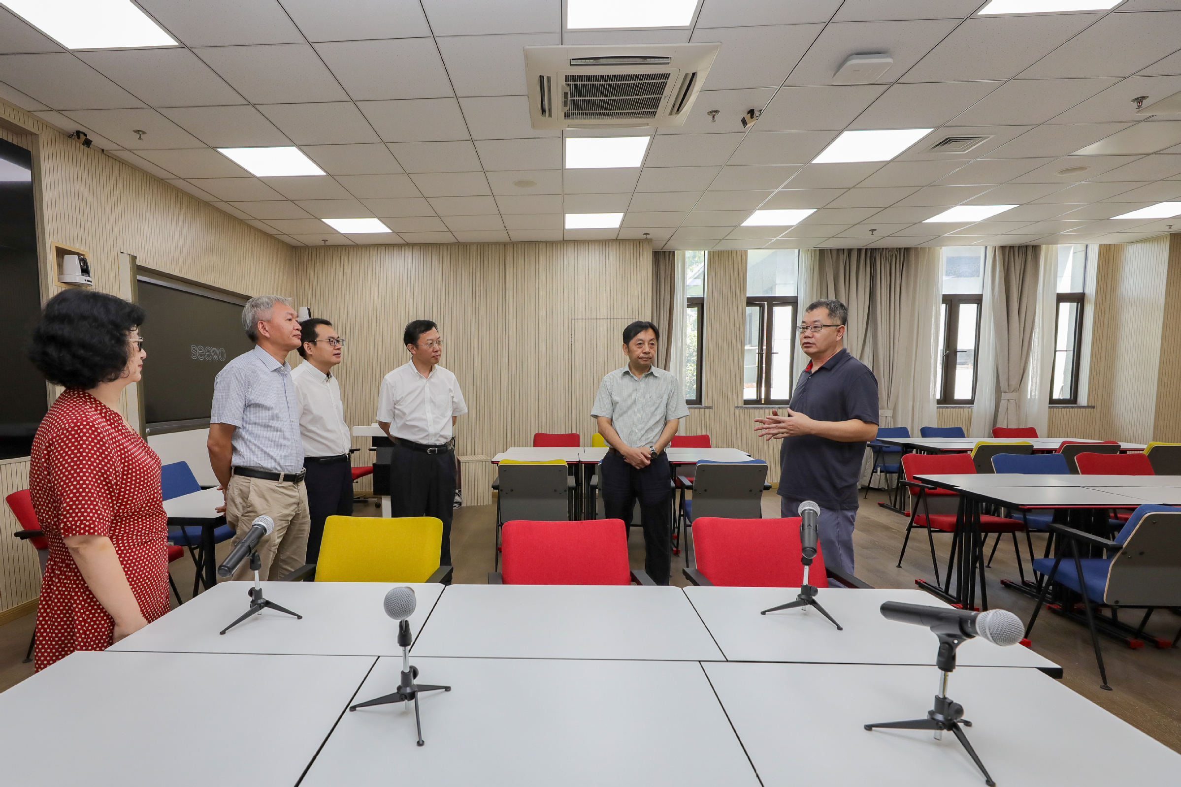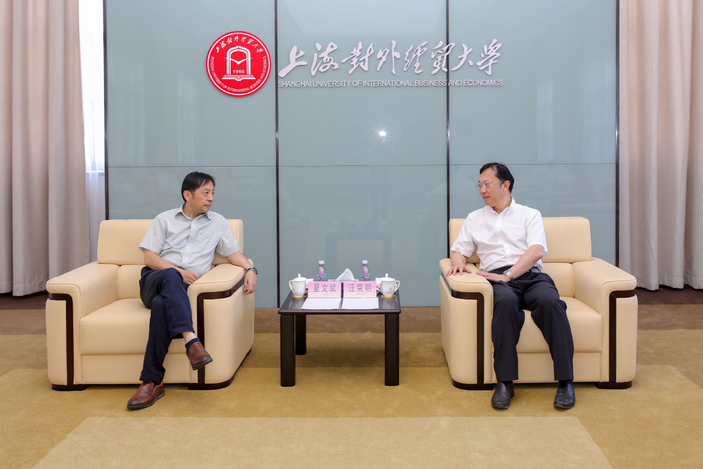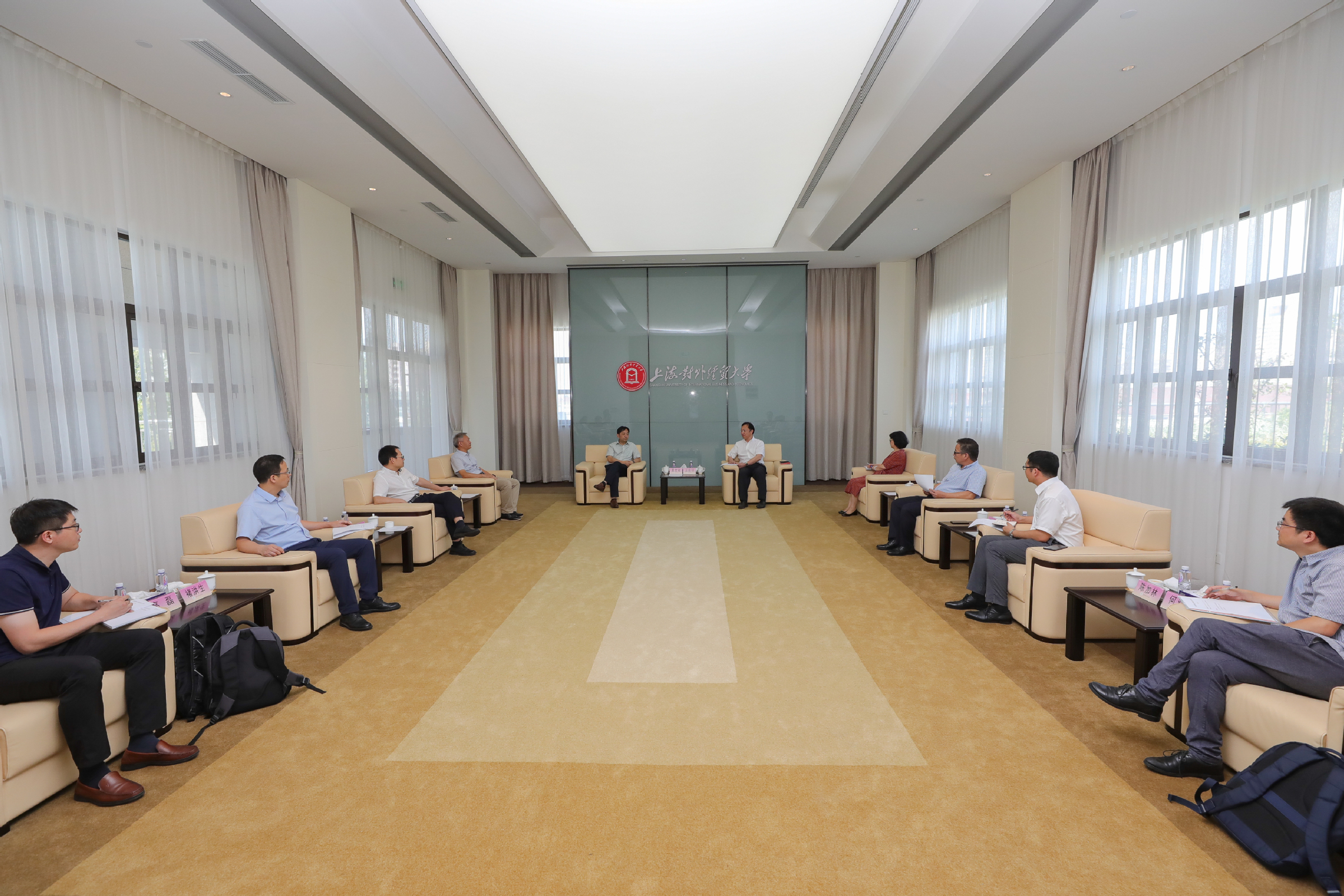 8月24日上午,对外经济贸易大学校长夏文斌、副校长王强、洪俊杰一行来我校古北校区调研交流。调研座谈会在综合楼贵宾室举行,校长汪荣明,副校长陈洁、张道方及相关部门负责人出席座谈会。