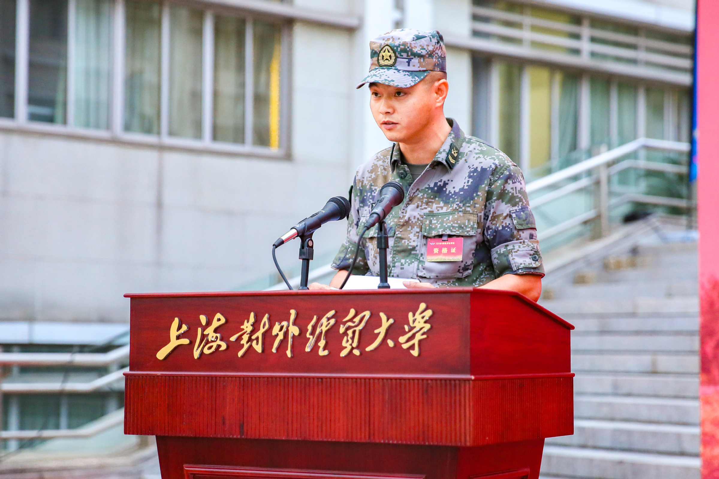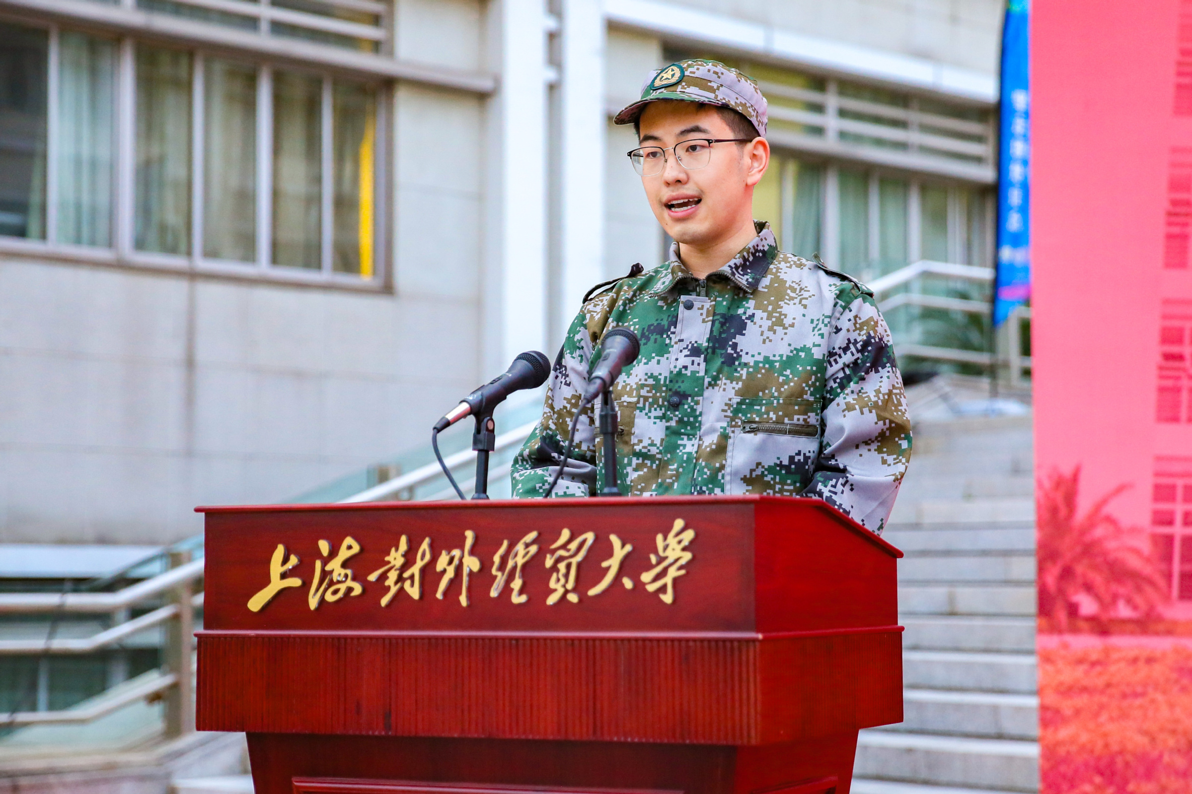 一团一连连长余泽文代表承训教官发言,表示将以身示范严格要求,锤炼学员顽强作风。三团一连张洛源同学代表受训学员发言,表示会以饱满的热情投入到军训中,展现经贸大学子的精神品质,高标准、严要求地完成本次军训任务。