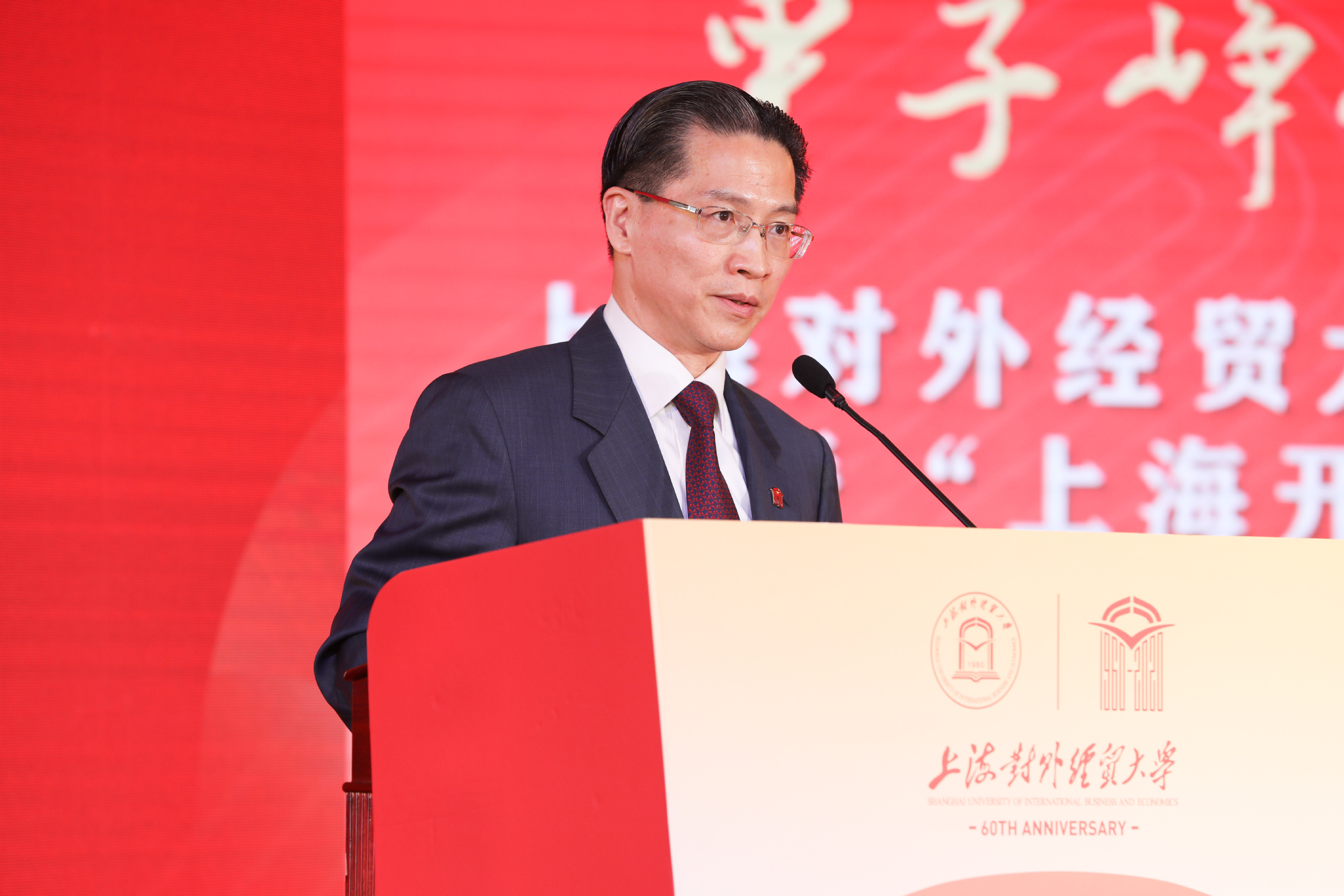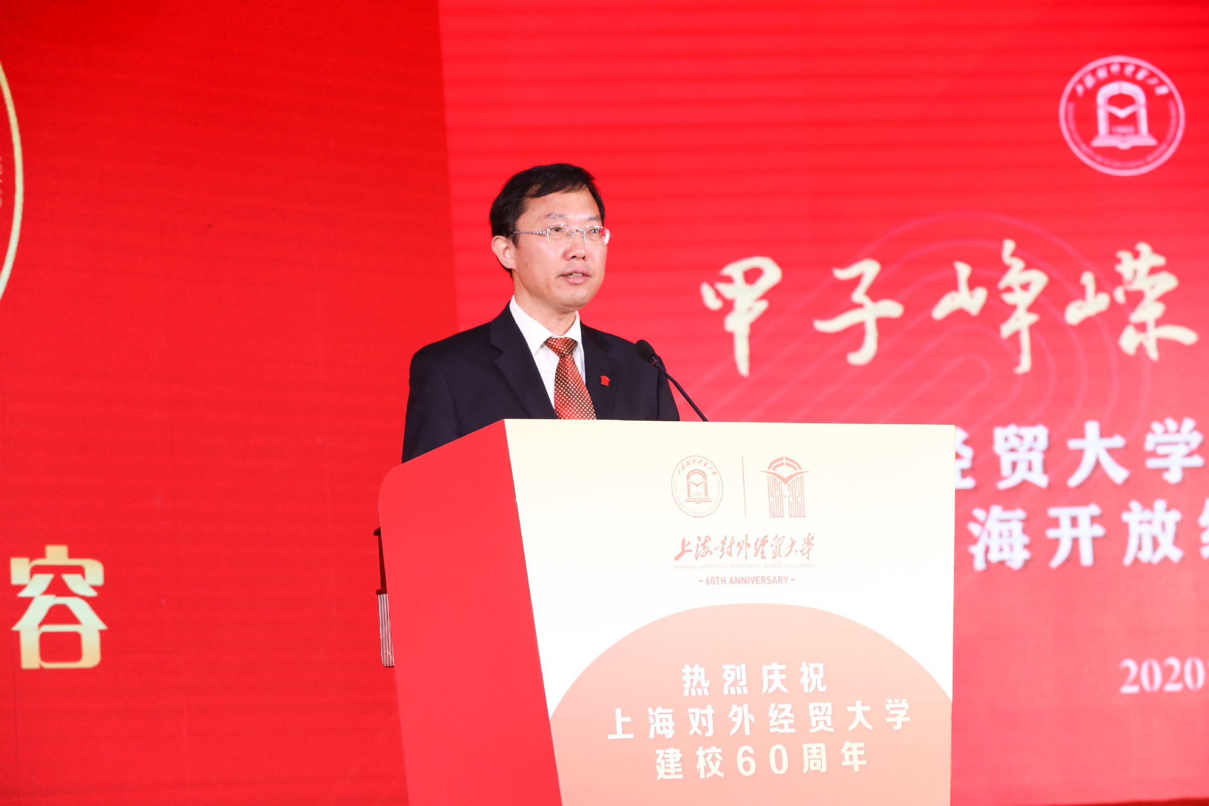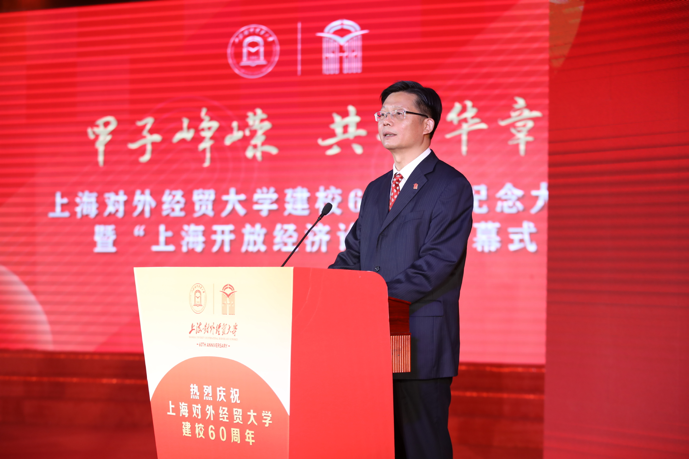 校长汪荣明在致辞中回顾了学校建校60年的发展历程。60年来,学校牢记为党育人、为国育才使命,服务创新型和开放型经济的国际经贸人才培养成绩卓著;坚守经世致用的学术宗旨,服务国家战略和上海城市发展的学术创新成果不断涌现;恪守文化传承创新职责,服务对外开放的国际化办学和文化育人成效不断彰显。汪荣明指出,面向未来,学校将以落实立德树人根本任务为天职,矢志不渝培养一流人才;以服务国家战略和上海高质量发展为使命,源源不断推出一流成果;以服务国家总体外交和开放战略为己任,持续打造一流的学术和文化交流平台。学校将以习近平新时代中国特色社会主义思想为指导,扎根中国大地办大学,紧紧围绕“高水平、国际化、特色鲜明的应用研究型大学”办学定位,牢牢把握“双一流”和贸易强国建设契机,努力向国内一流、国际知名的财经类大学目标迈进。