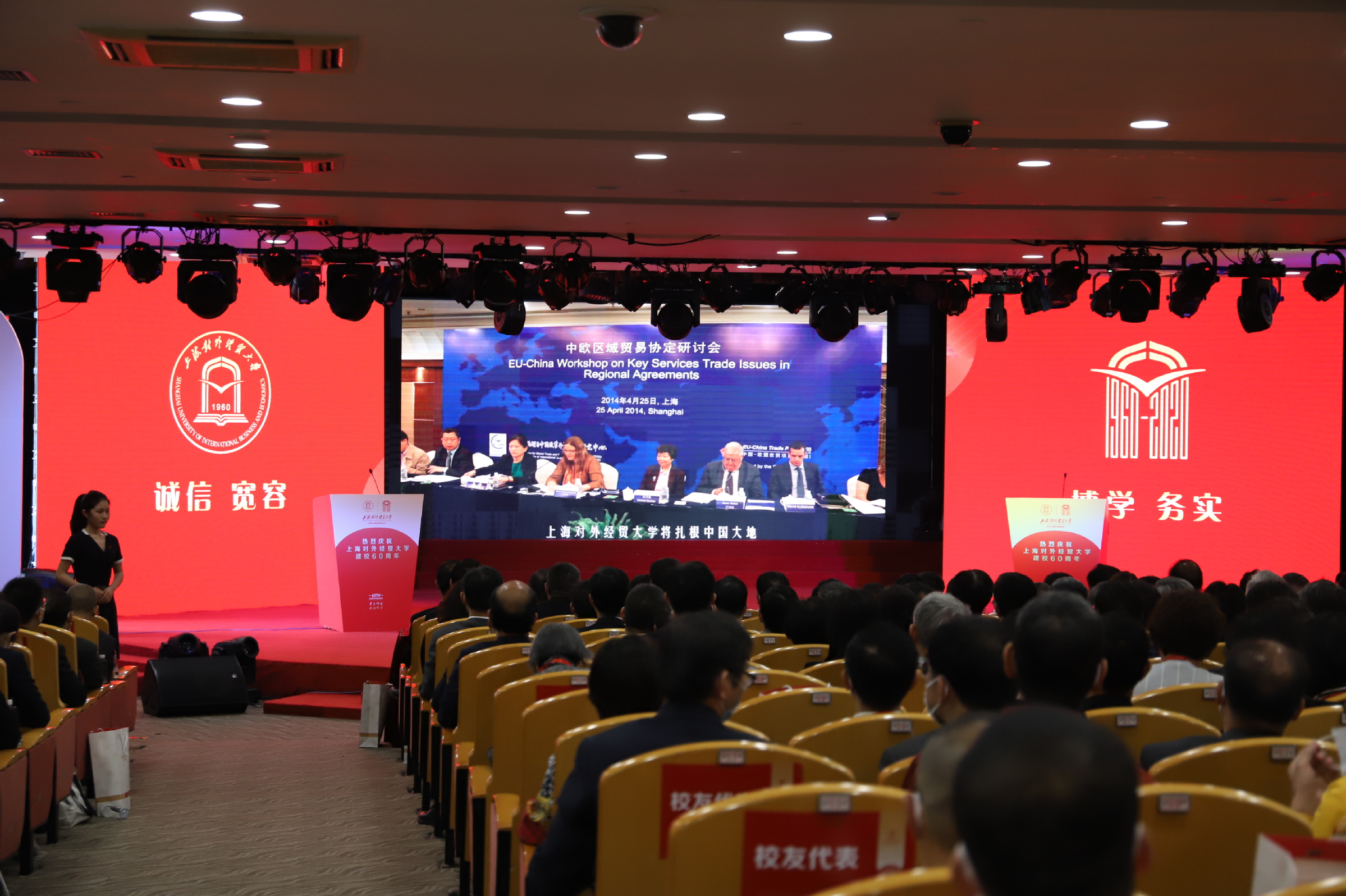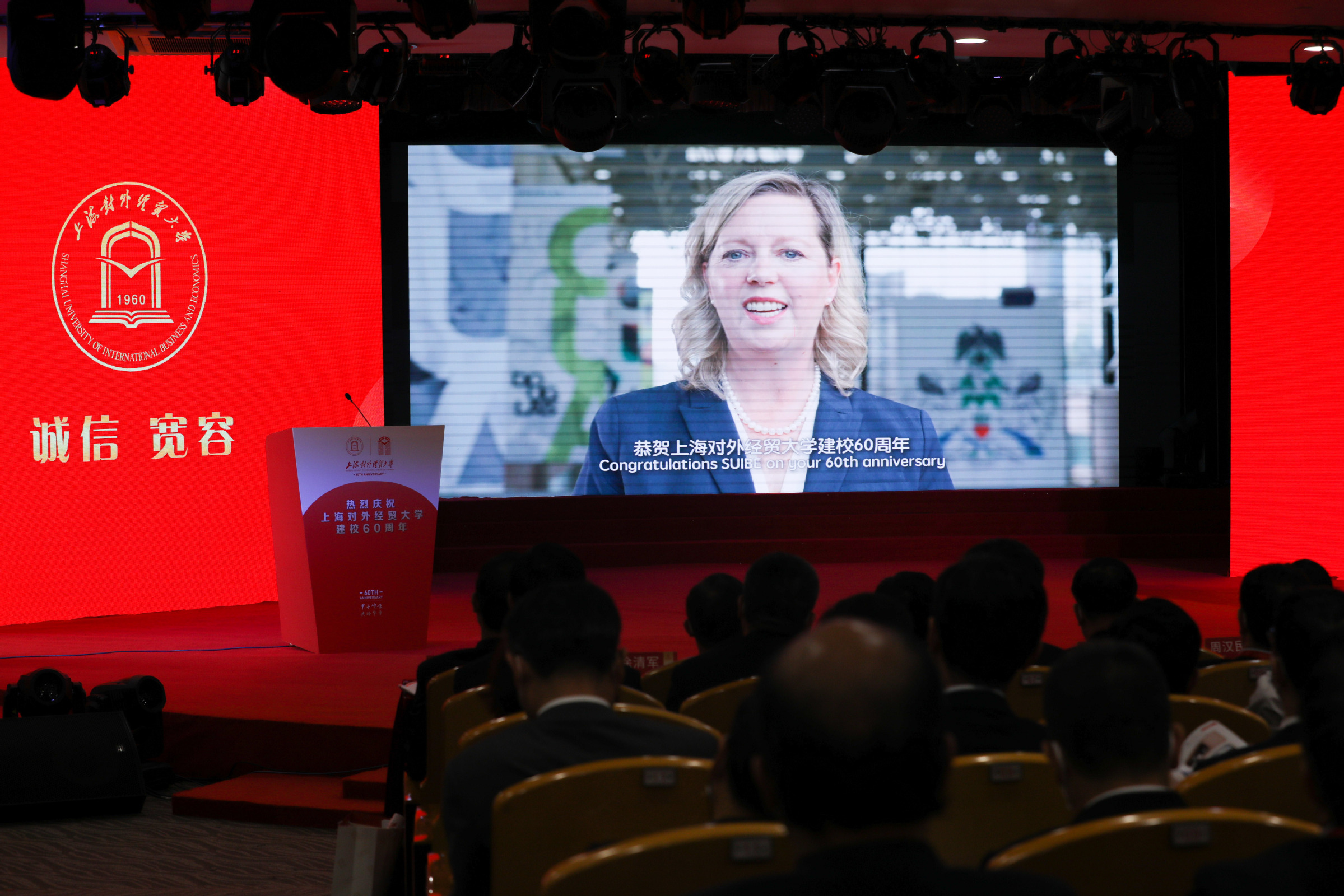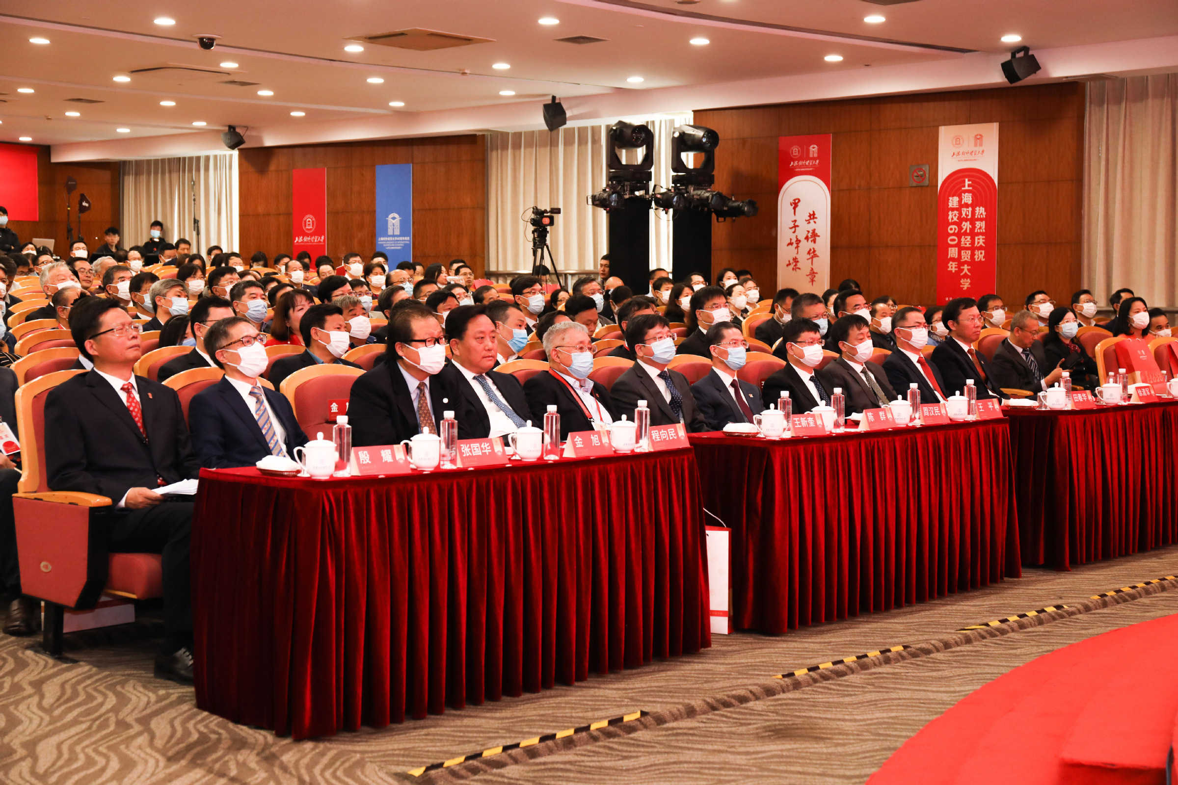 校长汪荣明在致辞中回顾了学校建校60年的发展历程。60年来,学校牢记为党育人、为国育才使命,服务创新型和开放型经济的国际经贸人才培养成绩卓著;坚守经世致用的学术宗旨,服务国家战略和上海城市发展的学术创新成果不断涌现;恪守文化传承创新职责,服务对外开放的国际化办学和文化育人成效不断彰显。汪荣明指出,面向未来,学校将以落实立德树人根本任务为天职,矢志不渝培养一流人才;以服务国家战略和上海高质量发展为使命,源源不断推出一流成果;以服务国家总体外交和开放战略为己任,持续打造一流的学术和文化交流平台。学校将以习近平新时代中国特色社会主义思想为指导,扎根中国大地办大学,紧紧围绕“高水平、国际化、特色鲜明的应用研究型大学”办学定位,牢牢把握“双一流”和贸易强国建设契机,努力向国内一流、国际知名的财经类大学目标迈进。