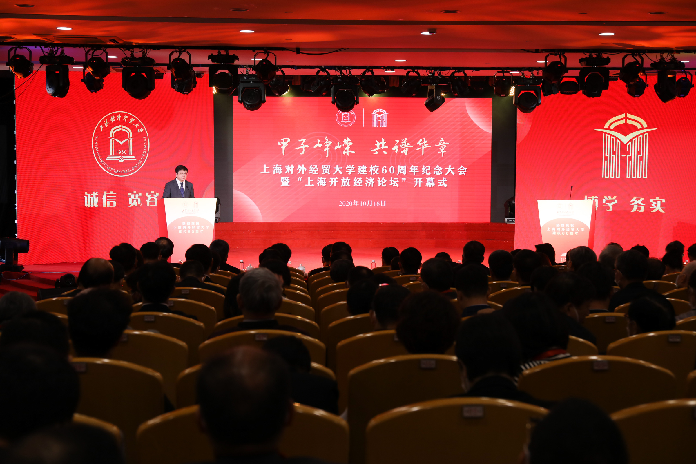 六十载峥嵘岁月,一甲子桃李芬芳。10月18日上午,上海对外经贸大学建校60周年纪念大会暨“上海开放经济论坛”开幕式在松江校区图文信息大楼507报告厅隆重举行。上海市人民政府副市长陈群,上海市政协副主席周汉民,上海市政协原副主席、原校长王新奎,上海市教委主任王平,松江区委书记程向民,浦东新区人大常委会主任田春华,中国国际贸易学会会长金旭,商务部政策研究室巡视员徐清军,商务部国际贸易经济合作研究院党委副书记于广生,中国国际贸易学会副会长李钢,上海市商务委员会副主任张国华,上海虹桥商务区管委会副主任陈伟利出席大会。来自全国三十多所高校领导,我校党政领导班子成员、老领导、老教师代表,校友代表以及在校师生代表等齐聚一堂,共襄盛典。