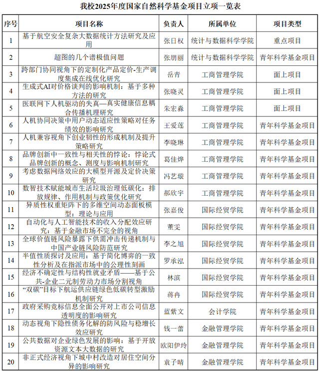 近日,国家自然科学基金委员会发布《关于2025年国家自然科学基金集中接收申请项目评审结果的通告》,我校在此次基金申报中取得了突破性成果。共获批项目20项,其中重点项目1项,面上项目3项,青年基金项目16项,再创历史新高。