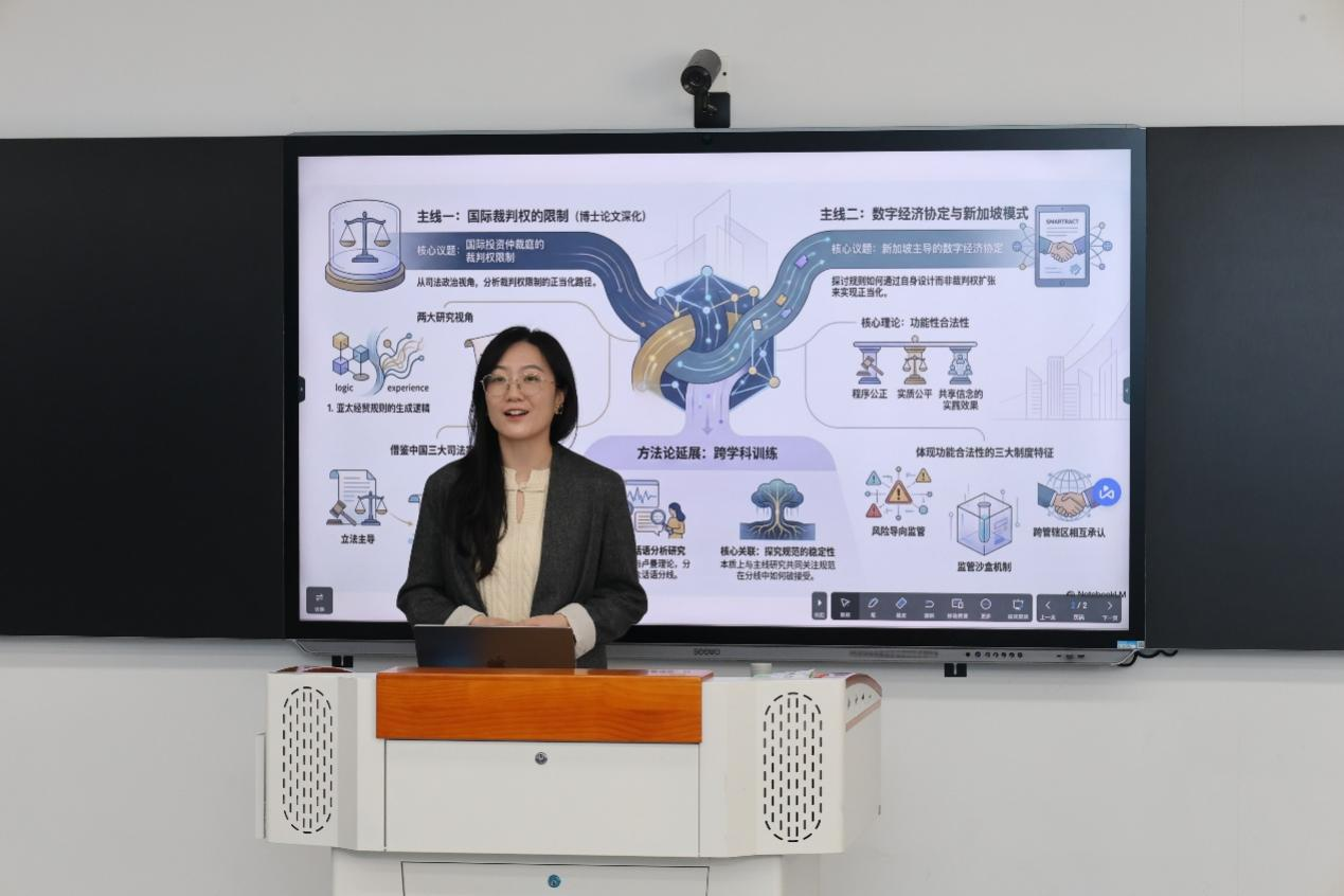 国际关系学系新进教师白玉川结合个人求学和工作经历,围绕出口管制在地化研究、经济安全、国际发展合作等研究方向,汇报了个人研究兴趣和未来规划。国际关系学系詹德斌教授结合个人经历进行了指导。