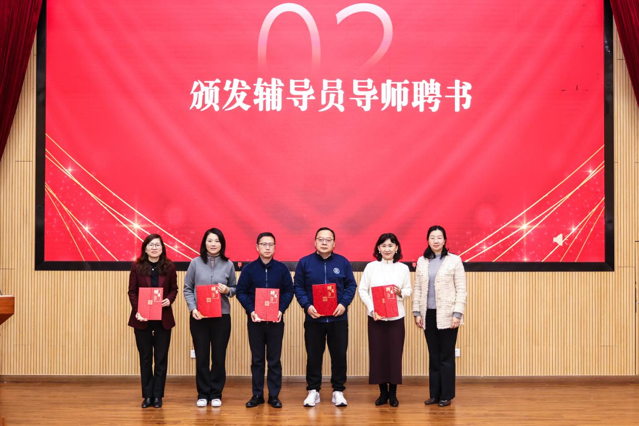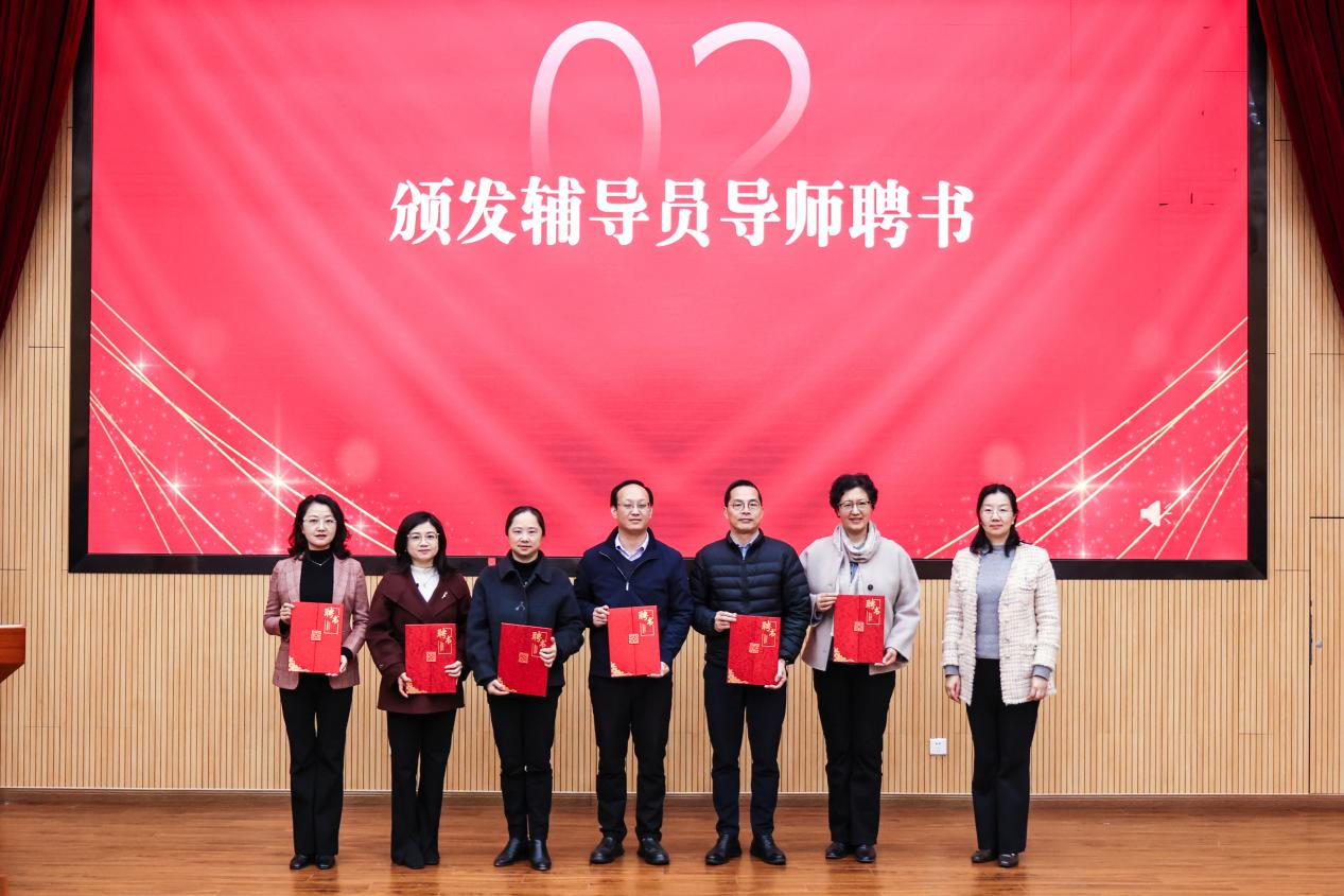 聘任仪式上,沈艺为辅导员“双导师”颁发聘书。学校分别为9名2025年新任辅导员配备了15名来自职能部门和学院的导师。自2019年实行新任辅导员导师制以来,导师们在“传、帮、带、教”中薪火相传,切实加强对新任辅导员的日常指导和关心,全方位精准赋能,助力其锚定职业航向、提升专业素养、坚定职业自信心与团队归属感。