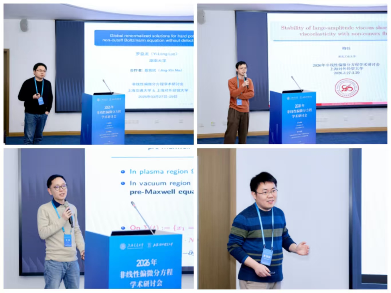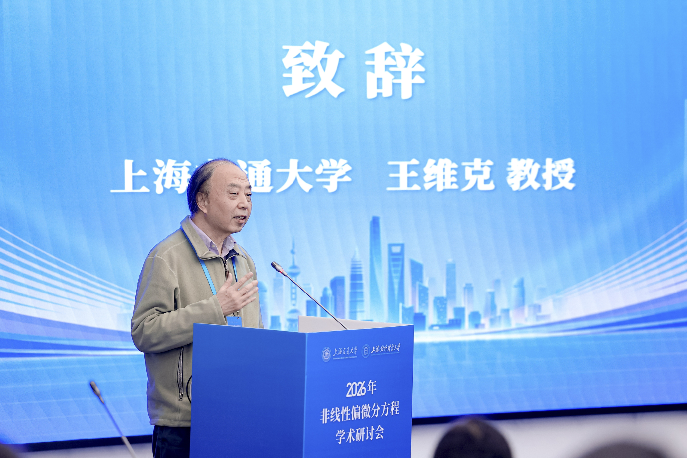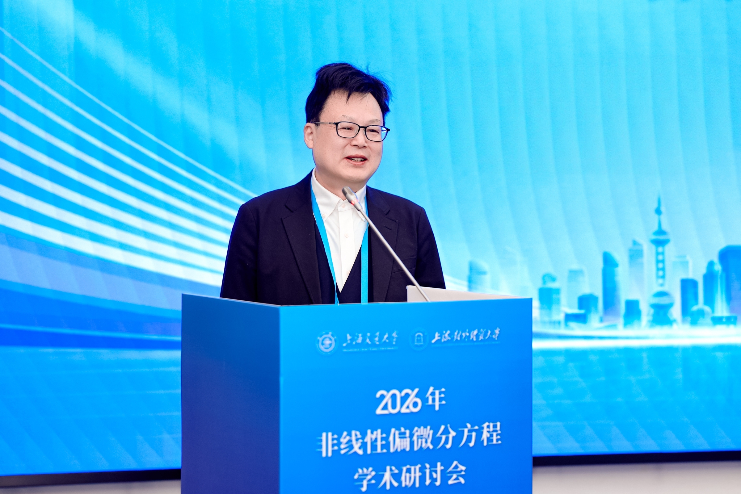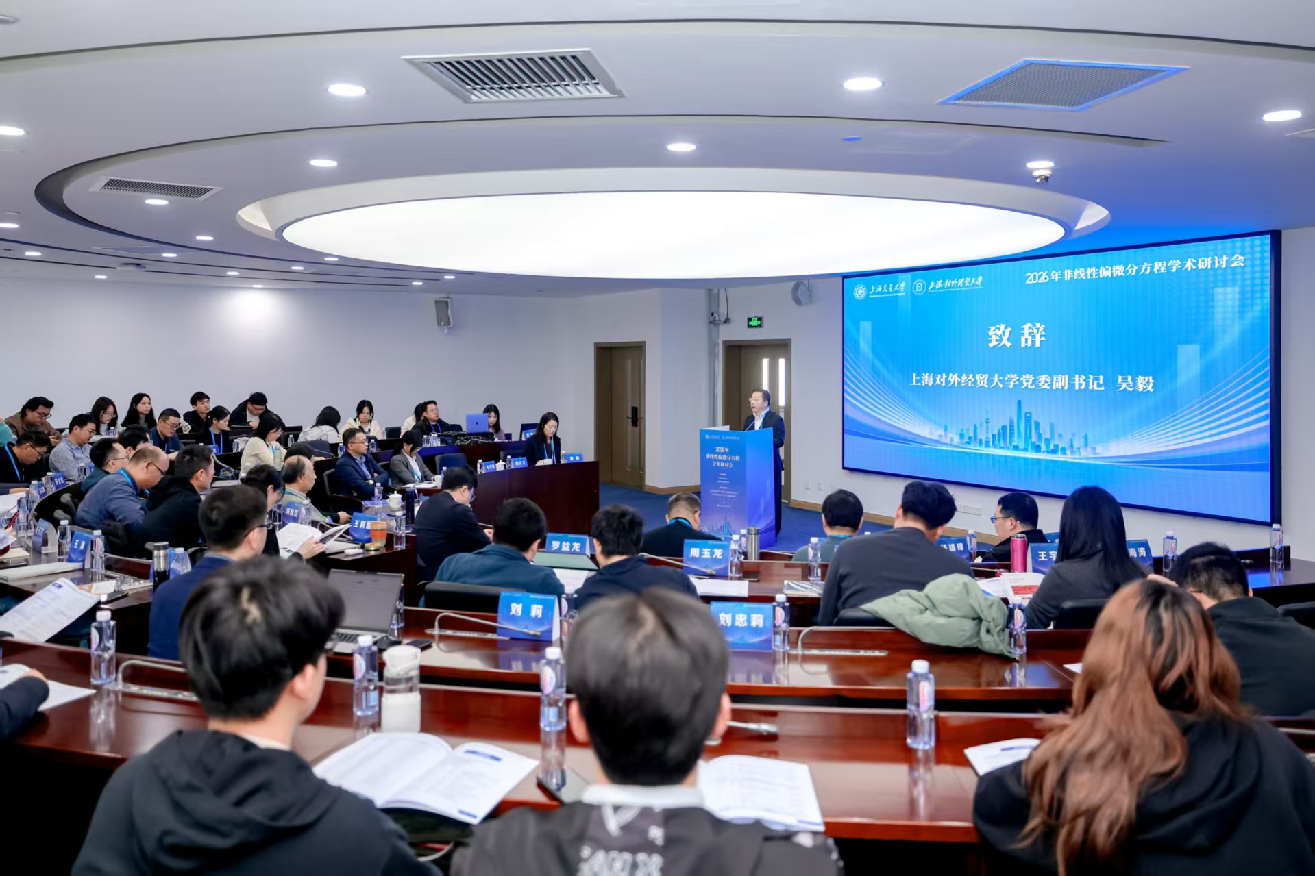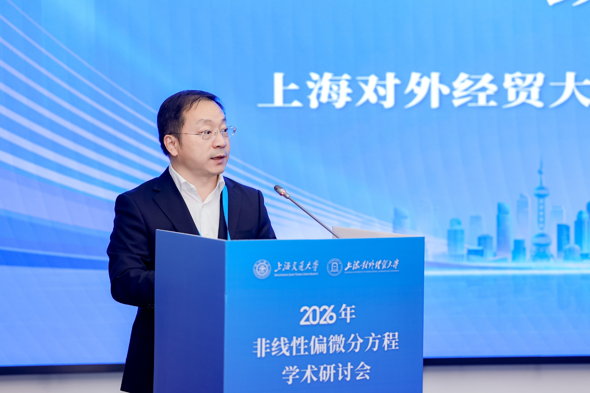 3月27日至29日,由上海交通大学与上海对外经贸大学联合主办,上海对外经贸大学统计与数据科学学院、人工智能研究院承办的“2026年非线性偏微分方程学术研讨会”在我校长宁校区顺利举行。上海对外经贸大学党委副书记吴毅出席会议并讲话。本次会议吸引了来自中国科学院、北京应用物理与计算数学研究所,上海交通大学、南京大学、武汉大学、中山大学、同济大学、四川大学、西北工业大学、华南理工大学、东南大学、湖南大学、华中师范大学、北京工业大学、安徽大学、广西师范大学等高校和科研院所的专家学者和统计与数据科学学院师生代表80余人参加。开幕式由统计与数据科学学院党委书记黄静主持。