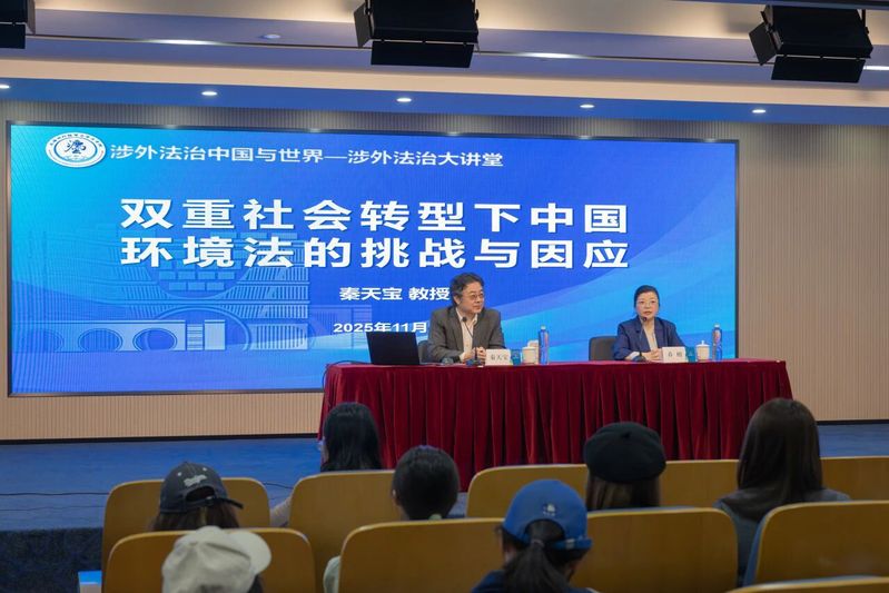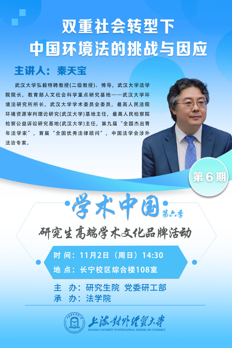11月2日,研究生高端学术文化品牌活动“学术中国”第六季第6期暨“法治中国与世界——涉外法治大讲堂”学术讲座在长宁校区综合楼108举行。本次讲座由研究生院、党委研工部主办,法学院承办,邀请武汉大学法学院院长秦天宝教授为师生做了《双重社会转型下中国环境法的挑战与因应》专题讲座,200余名师生参加学习。讲座由法学院党委书记乔檀主持。