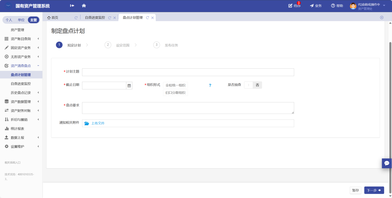 第一步:主管部门老师进入平台后,点击【盘点计划管理】→【新增盘点任务】,盘点任务计划发布图中,如下图所示: