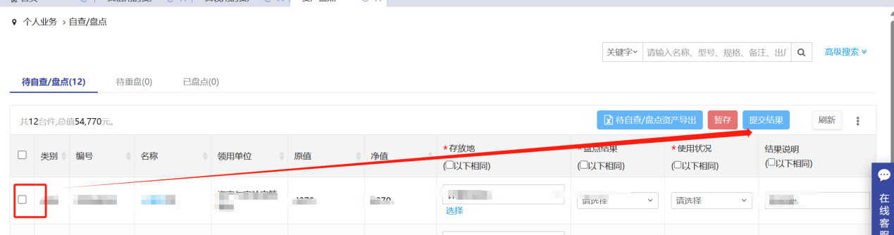 第二步:对每一个资产进行盘点,选择“盘点结果”、“使用情况”,选择完成之后勾选资产点击【提交结果】即可: