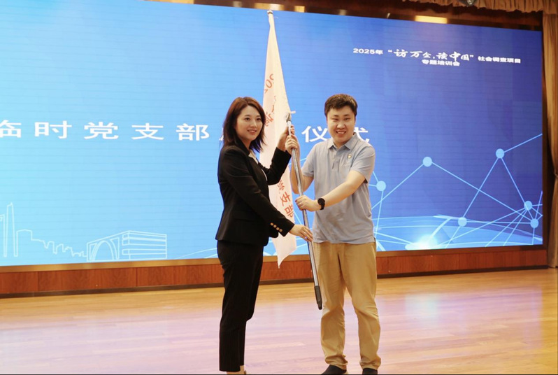 黄静为项目临时党支部授旗。为进一步发挥党建引领和保障作用,把党支部建在重大项目上,2025年“访万企,读中国”社会调查项目成立临时党支部,由司继春担任党支部书记,统计与数据科学学院团委书记岳怡寒担任副书记,党委组织员雷铮和研究生党员封冰悦、严泓赫担任支部委员。