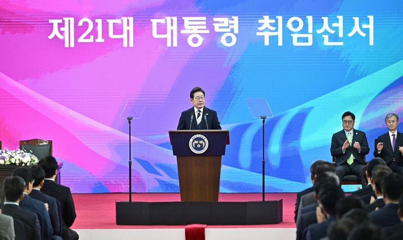 South Korea's President Lee Jae-myung (left) delivers a speech after taking his oath during his inauguration ceremony at the National Assembly in Seoul on June 4, 2025. Photo: VCG